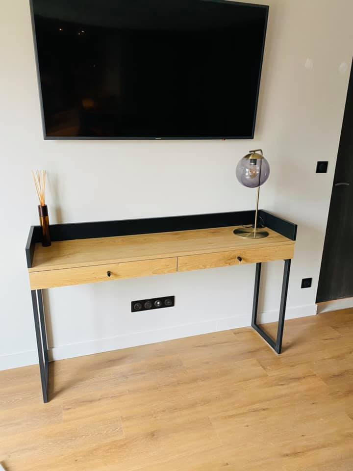 Réalisation d’une console décor stratifié décor noir et ton bois tiroir intérieur chêne massif et piètement acier laqué