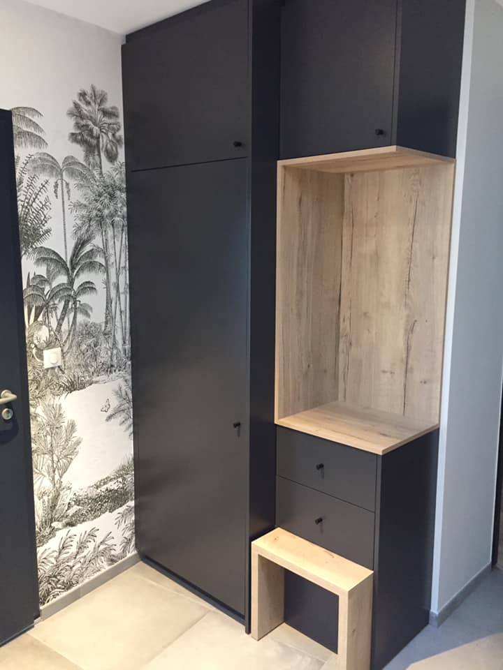 Réalisation d’un meuble dressing en médium laqué . ensemble composé d’une penderie d’un tiroir et d’un banc escamotable