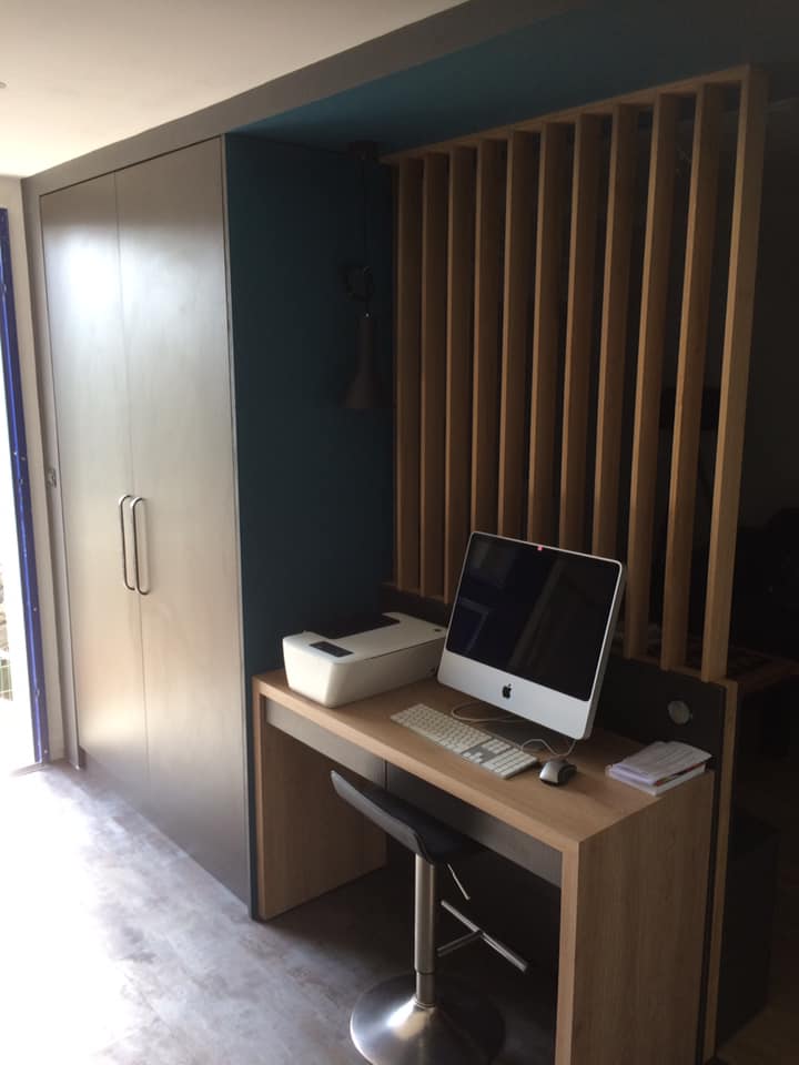 Agencement intérieur un coté meuble entrée dressing bureau et de l’autre meuble salon télé ensemble réalisé en mélaminé et stratifié devanture medium laqué