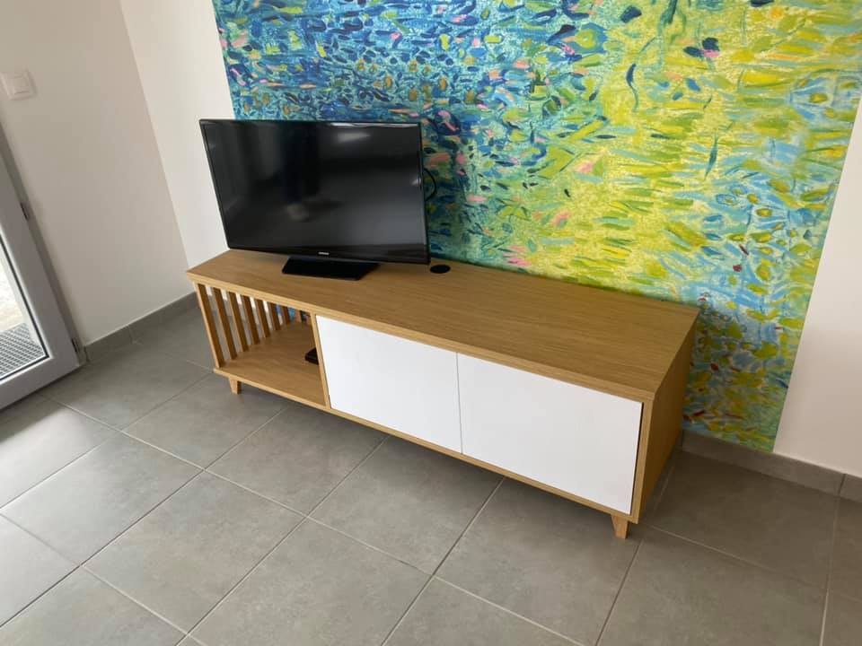 Meuble salon réalisé en mélaminé deux décors et filtre bois chêne massif huilé