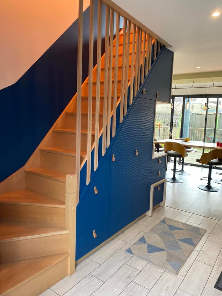 Réalisation d’un meuble sous escalier ensemble réalisé en méduim structuré laqué avec niche ouverte stratifié ton bois et filtre bois chêne massif huilé naturel