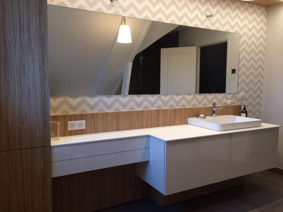 agencement salle de bains ensemble stratifié plan monochrom blanc bandeau led création tiroir cosmétique
